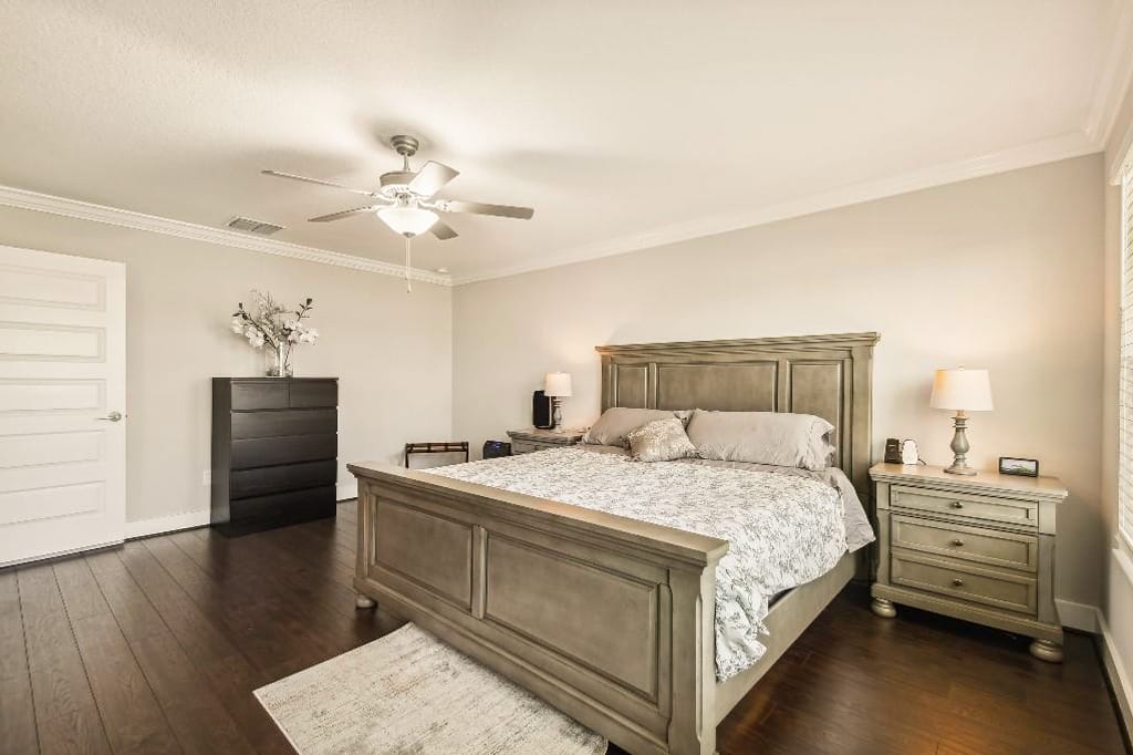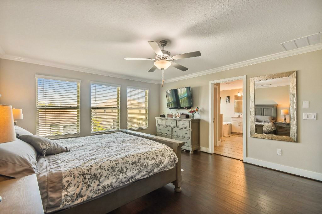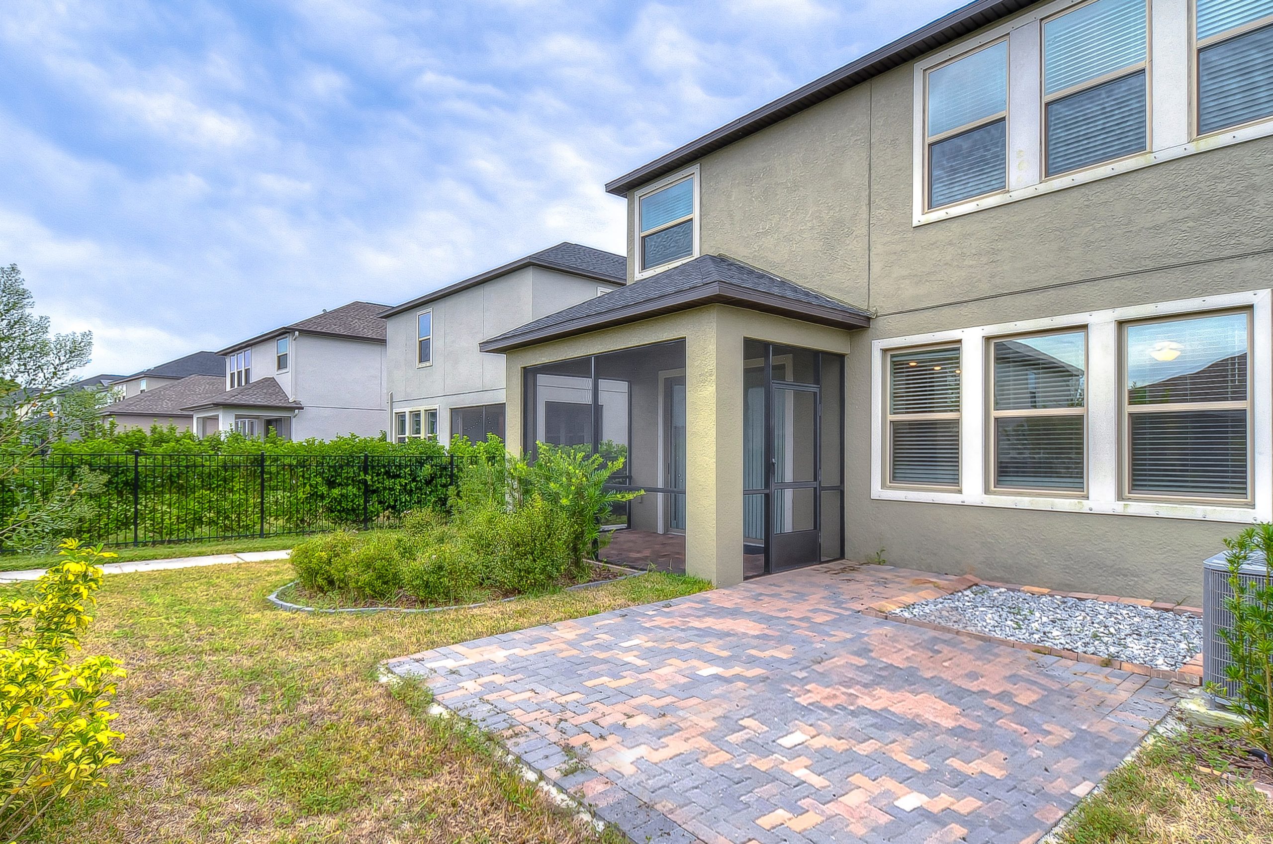 The first floor features crown molding, giving it an upscale feel that carries through the powder room, study, and connected kitchen, living, and dining areas that overlook the yard. Outside, a screened lanai extends the living area while providing much-needed protection from the area’s critters. There’s also a large paver patio, so tenants and guests can enjoy time in the sun in the partially-fenced backyard.