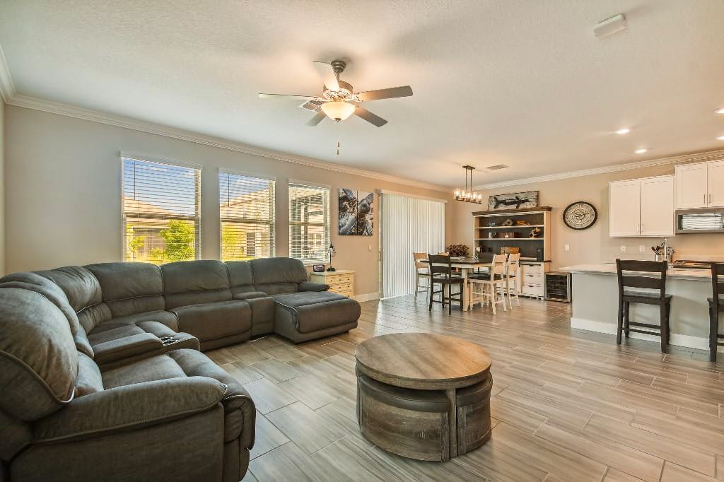 As soon as you enter the home’s foyer, you’re greeted with high ceilings, wood-look tile flooring, and large windows that make it light and airy. The home was designed to be energy efficient, with central A/C to keep it cool year-round, and the floor plan lends itself to a relaxed daily life.