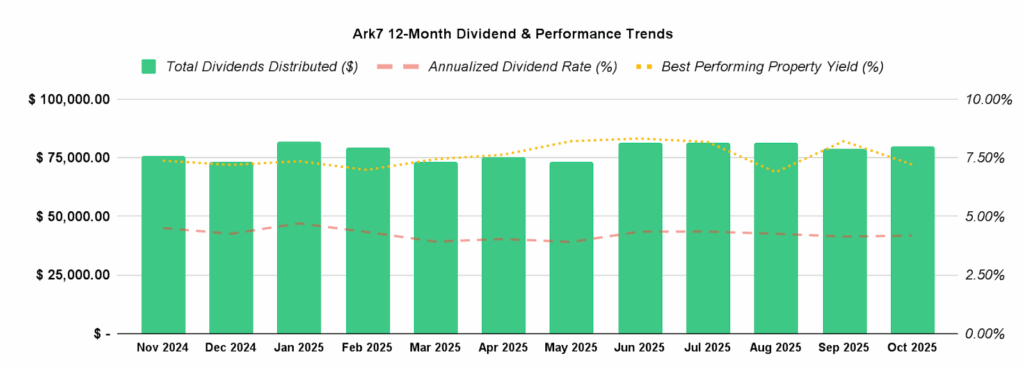 October continues to be a month of steady returns for Ark7’s portfolio, with $79,888.46 in total dividends distributed and a 4.18% annualized dividend return rate. Urbana-S11, Berkeley-M3, and Dallas-S9 led in dividend yield, delivering returns of 7.22%, 7.10%, and 6.27%. This shows the cash-yielding strength of our top-performing assets.